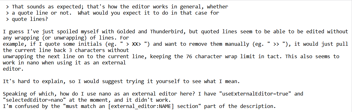 If you remember, I had asked you why when I tried to set nano as my external editor it didn't work (via editing the .ini), until I actually found it in the GUI config and figured out how it actually stores that setting - which was way off from what I had assumed.